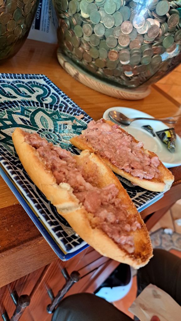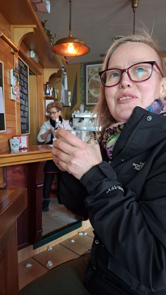 Menomatkalla pysähdyttiin muuten kivassa lähikuppilassa, suolaiset churrot ja joku leipä, pari kuppia kahvia ihan lämmityksen vuoksi! Se oli mukava keidas kylmyyden keskellä. Vaikka tuskin siellä lämmitys päällä oli, ero tuntui vaan niin huomattavalta ettei siitä välittänyt.