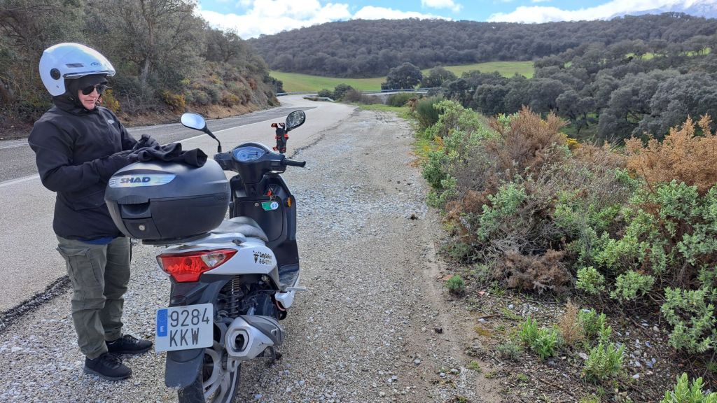 Mutta vuorille kylläkin. Olipa taas hyvä idea. Lähtiessä taisin ihan tosissani sanoa että laitanko pitkän paidan takin alle? Siitä alle tunti ja ukko tärisi ajaessaan kuin viimeisiään vetelevä pesukone loppulinkouksessa! En osaa sanoa koska olisi kylmänyt noin paljon? Ehkä silloin kun vein bemaria Liperiin talvisäilöön ja Imatralta eteenpäin oli 7 astetta ja vihmoi vettä? Nyt lämpötilan huomattava muutos tapahtui vuorilla, kun vaihdettiin Malagan piiristä Granadan vastaavaan, 6 astetta näytti puhelimen mukaan ja kova tuuli. Vähön ennen sitä alkoi myös arveluttamaan että riittääkö bensa? 2/10 näytti tankki. Sitten alkoi vielä näyttämään että kohta sataa ja lujaa, onneksi siltä vältyttiin. Pakko oli kuitenkin pysähtyä haarahypyille ja hieromaan ihoa. Välillä kyllä tuntui että hivenen irtoan ruumiistani, tai ehkä se oli juuri toisinpäin? Mutta tunne lienee ollut molemminpuolinen.