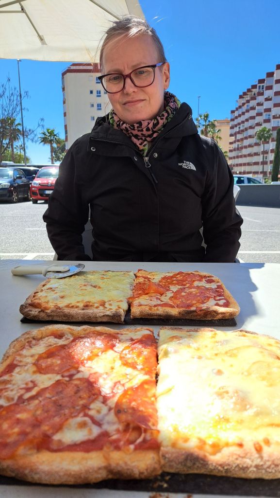 Nyt jo hymyilyttää kun alhaalla lämpimässä, takkia ei ole vieläkään saatu päältä mutta pitsa maistuu! Tämmöinen kioski josta myydään itse tehtyä pitsaa ulos. Namia on!