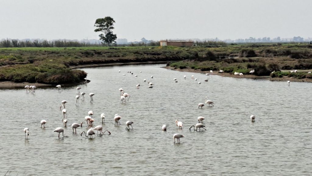 Flamingot on vänkän näköisiä lentäessään, kaartelevat monta monta kertaa, kuin lennonjohdon lupaa odottaen, ennenkuin laskeutuvat. Sitten tullaan nopeasti alas. Varmaan tutkivat parhaan eväspaikan? Yhessä kun niitä laskeutuu kymmenittäin niin hirveä läpytys kuuluu! Mukava nuita on katella. Ennenkin nähnyt, mutta ne oli vain maissa, kävelivät kaukana.