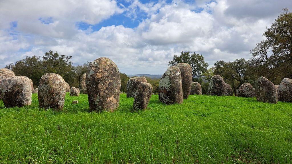 Seuraavaan päivään: Almendres Cromlech, 2000 vuotta vanhempi kuin Stonehenge. Kesäpäiväntasauksen mukaan suunnattuja kiviä, aurinkoa tietysti palvottu. Ympäri palloa kaikkialla, tuhansia vuosia, yhtaikaa ja erikseen. On nämä vaan hienoja! Jotenkin tunkee väkisin mieleen oma pienuus ja elämän lyhyys. Voispa elää eri aikakausilla, kokeilla vähän jokaista.
